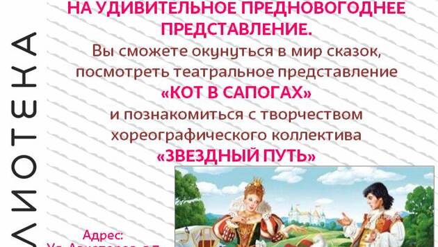 Спектакль «Кот в сапогах» состоится в библиотеке им. Р. Рождественского 15 декабря Семейный досуговый центр «Клубок» представляет удивительную предновогоднюю сказку с участием хореографического коллектива «Звездный путь». Веселая и поучительная история, рассказанная давным-давно французским писателем Шарлем Перро, в исполнении талантливых артистов заиграет другими красками и приобретет новый смысл, понятный и близкий современным детям. И, конечно же, не обойдется без новогодних чудес. Мероприятие пройдет 15 декабря в библиотеке № 221 им. Р. Рождественского по адресу: ул. Авиаторов, д. 7. Телефон: 8 (495) 435-44-51. Начало – в 19:00. Вход свободный. Возрастные ограничения: 0+. Анна Васенина Фото: библиотека № 221