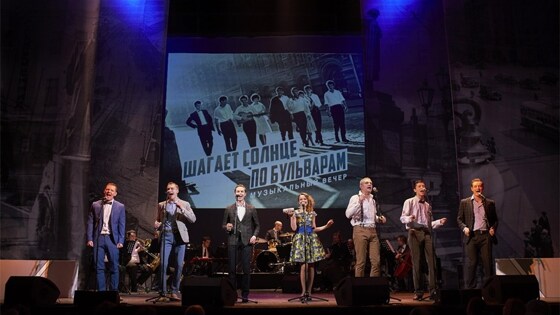 Как удивительно совпали время и место. Вот уж прав был Александр наш Сергеевич, констатируя наличие странных сближений. Нужно же было, чтобы театр “Современник” на время реконструкции основной сцены на Чистых прудах, обосновался именно здесь. Здание, которое ныне величается Дворцом на Яузе в 60-е именовалось скромно – Телевизионный театр. Отсюда, до того, как был построен телецентр в Останкино, шли в эфир самые любимые народом передачи, начиная с “Голубого огонька” и заканчивая КВНом. На этой сцене когда-то пели и танцевали не только веселые с находчивыми, но и "а ну-ка парни" с "а ну-ка девушками" (были в те времена такие замечательные, свои, родные, а не скопированные у “западных партнёров” передачи). И вот спустя почти шесть десятилетий на неё вышли молодые актёры театра “Современник” с теми самыми песнями, которые тут звучали в те, почти что былинные, времена. Тот случай, когда и стены помогают. Фото: Сергей Петров И незримая эта помощь, наверное, пришлась им как нельзя кстати, ведь о том времени они знают только по рассказам старших да по кинофильмам, а в зале сидят люди, для которых оно – не отдаленная история, а часть собственной биографии и они-то будут самыми строгими судьями. Затея из разряда безумства храбрых? Безусловно. Тем радостней, что она удалась. Поющих актёров в труппе “Современника” немало, но музыкальные спектакли – не в традициях этого театра, а в рамках милых сердцу капустников им, по всей видимости, стало тесно. Накопившаяся вокальная энергия получила выход в концерте, устроенном по случаю фестиваля “Оттепель: лицом к будущему”. Пели не под минусовку, а в сопровождении настоящего оркестра. Пели и радовались – то, что тревожило людские сердца в середине прошлого века, трогает их и в уже набравшем скорость веке нынешнем. Но фестиваль прошёл, а желание петь осталось. Фото: Сергей Петров Идея родилась у заместителя худрука театра по литературной части Евгении Кузьминой : “ Современник” - дитя оттепели, а что, если любимые песни той прекрасной, но короткой эпохи не просто собрать в концерт, а попытаться с их помощью рассказать о родном театре и о людях, стоявших у его истоков. Так родился вечер-посвящение современниковцам первого призыва “Шагает солнце по бульварам ”. Режиссёр Полина Рашкина выстроила его предельно лаконично, опираясь только на внутреннюю драматургию песенного материала. И это решение было правильным, ведь каждая песня в те времена была законченной историей, своего рода музыкально-драматической миниатюрой с сюжетом, действующими лицами, непременной завязкой-кульминацией-развязкой. Песни отбирались не столько по популярности (кажется, что непопулярных тогда вообще не существовало), сколько аллюзивным отсылам к истории “Современника” и творившим её людям. Эта, по большей части невидимая зрителю, жизнь театра (подбор архивных материалов Татьяны Прасоловой), выстроенная в стремительный видеоряд Светланой Бодровой, разматывалась перед глазами, словно ариаднина нить из клубка памяти. На экране, размером в полсцены фотографии, любительская киносъёмка, сделанная во время репетиций и затягивавшихся далеко за полночь обсуждений, зафиксированные на плёнке сцены из легендарных спектаклей, иногда официальная кинохроника. Кадры сменяют друг друга с умопомрачительной быстротой. Ловишь себя на же
