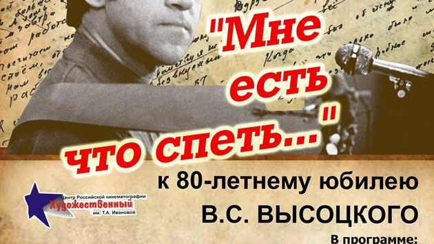 25 января в 16:45 в Центре Российской кинематографии «Художественный» им. Т. А. Ивановой состоится киновечер «Мне есть, что спеть…», посвящённый 80-летнему юбилею Владимира Высоцкого и открытие фотовыставки «Высоцкий в кино». Советский поэт, актер театра и кино, автор-исполнитель, певец и композитор, писатель Владимир Семёнович Высоцкий родился 25 января 1938 года, умер 25 июля 1980 года. Прожил мало, но за свою недолгую жизнь написал около двухсот стихотворений, примерно 600 песен, снялся в более чем 30 фильмах, сыграл много ролей в театре. Самая его большая роль в театре – Гамлет. В Арт-фойе и Большом зале ЦРК «Художественный» состоится небольшой концерт самарских певцов, музыкантов и бардов, которые исполнят песни Владимира Высоцкого в своей интерпретации. Программа киновечера: - выступление исполнителей песен В. Высоцкого: лауреатов международных конкурсов Надежды Сорокиной, Евгения Разина, исполнителей песен и романсов В. Высоцкого Владимира Овчинникова и Юрия Самарского; - открытие выставки «Высоцкий в кино»; - фильм «Опасные гастроли» режиссёра Георгия Юнгвальд-Хилькевича. Ведущий вечера - член Союза кинематографистов Российской Федерации, писатель, кинодраматург, издатель Виталий Аркадьевич Добрусин. Время работы выставки: ежедневно с 09:00 до 20:00, с 25 января по 27 февраля 2018 года (включительно) Открытие выставки: 25 января в 16.45