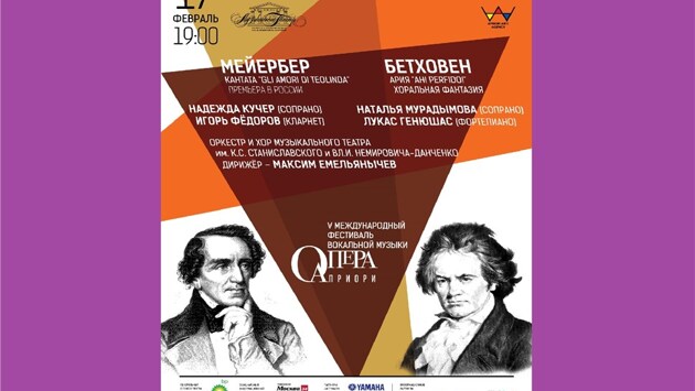 На концерте будет представлена российская премьера Кантаты (монодрамы) Gli amori di Teolinda для сопрано, кларнета, мужского хора и оркестра (1816) Джакомо Мейербера. Солисты — Надежда Кучер (Беларусь), награждённая Гран-при "Певица мира 2015" на Международном конкурсе оперных певцов в Кардиффе, двукратный лауреат "Золотой Маски", солирующая в Пермском театре оперы и балета, приглашённая солистка европейских оперных домов, а также Игорь Фёдоров, лауреат международных конкурсов, известный российский кларнетист. Его игра звучит в фильме "Кавказский пленник" Сергея Бодрова. Надежда Кучер. Фото: Ольга Качура Два произведения Людвига ван Бетховена, редко звучащих в России, открывают концерт. Первое произведение — большая концертная ария Ah! perfido! для сопрано и оркестра (1796), в которой выступит Наталья Мурадымова, ведущая солистка МАМТ, лауреат премии Casta Diva 2015. Наталья Мурадымова. Фото: Ира Полярная/Опера Априори Второе произведение — Фантазия до минор для фортепиано, хора и оркестра (1808), где солировать будет российско-литовский пианист Лукас Генюшас, лауреат международных конкурсов имени Ф. Шопена, Дж. Бахауэр, П.И. Чайковского и Deutsche Pianistenpreis. Сольные партии в хоре будут исполнены такими солистами оперной труппы театра, как Сергей Николаев, Михаил Головушкин, Анастасия Хорошилова, Лилия Гайсина, Мария Макеева, Кирилл Золочевский. В качестве руководителя хора и оркестра театра выступит Максим Емельянычев — главный дирижёр швейцарского камерного оркестра Il Pomo d’Oro, обладатель премий "Золотая Маска" и ECHO Klassik, номинант премии Grammy 2017, который становится всемирно известным.