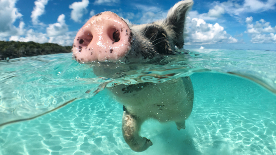 Биг Мейджор Кей, или Остров свиней на Багамах, на необитаемых пляжах которого живут несколько десятков свиней и поросят. Они появились здесь в 90-х стараниями свиноводов с соседнего обитаемого острова, которые переселили сюда животных из-за многочисленных жалоб на неприятные запахи.