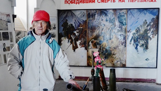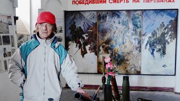 Три раза в неделю Евгений Крутень из поселка Терскол в Кабардино-Балкарии садится в вагончик канатной дороги и поднимается на высоту 3500 метров над уровнем моря — иначе на работу ему не попасть. Евгений Ильич — смотритель самого высокогорного музея в стране, Музея обороны Приэльбрусья. На заоблачном фронте 75 лет назад, 13 февраля 1943 года, группа альпинистов под командованием мастера спорта СССР, лейтенанта Николая Гусака поднялась на западную вершину Эльбруса и установила на ней Красное знамя. Через несколько дней, в течение которых бушевала снежная буря, на восточную вершину поднялась группа Александра Гусева. Стало понятно, что Эльбрус вновь перешел под контроль советских войск и фашистская операция «Эдельвейс» по покорению Главного Кавказского хребта остановлена. Этим событиям предшествовали долгие и напряженные бои: за склоны высочайшей вершины Европы сражались с августа 1942 года по февраль 1943-го. Сегодня о трагических событиях того времени в местах, где располагался самый высокогорный фронт Второй мировой войны, напоминает лишь памятник «Героям обороны Приэльбрусья», регулярные находки поисковиков и музей — две крошечных комнатушки на высоте 3500 метров над уровнем моря, куда, несмотря ни на что, регулярно приходят туристы. Добраться сюда из столицы Кабардино-Балкарии не так-то просто. Если нет своей машины или вы не едете в составе экскурсии, нужно сесть на маршрутку Нальчик — Терскол или Нальчик — Тырныауз, а из Тырныауза уже ехать в Терскол. И, конечно, всегда есть вариант попробовать поймать попутку. Обычно в горах люди довольно отзывчивы и с пониманием относятся к чужим проблемам. На поляне Азау на высоте 2350 метров любопытному туристу следует определиться, какой канаткой воспользоваться, чтобы подняться еще выше, — новыми сияющими вагончиками или старыми советскими красными, дарящими заряд бодрости и выброс адреналина. По второй и ездит Евгений Крутень — хранитель Музея обороны Приэльбрусья. Он работает здесь недавно — три года, пришел после смерти предыдущего директора, трудившегося в музее со дня основания. — Музей существует примерно с того времени, как была построена самая первая канатная дорога до станции «Мир», — более 40 лет, — рассказывает Евгений Ильич. «Каждый год мы хороним по 10−20 человек» Те самые Красные знамена в музее не сохранилось — да и вряд ли могли бы. — Там все-таки ураганные ветры, никакие флаги не стоят на вершине дольше недели, потому найти что-то не представлялось возможным, — поясняет Крутень. Экспонаты — это мемориальная доска с именами и фамилиями альпинистов, взявших вершины Эльбруса в феврале 1943 года, их фотографии, в том числе сделанные во время исторического восхождения и установки флага на восточной вершине горы, и документы, посвященные обороне Кавказа. А еще — собранные поисковиками части обмундирования советских воинов, защищавших склоны Эльбруса. — Есть миномет, пушка-«сорокопятка». Эти орудия альпинисты перенесли вручную из Грузии через перевал Донгузорун, — показывает Крутень. Экспозиция пополняется по сей день, потому что на Эльбрусе продолжают работать поисковые группы, разыскивающие останки советских солдат для перезахоронения. Так, летом в музее появился небольшой стенд, посвященный роте лейтенанта Гургена Григорянца, принявшей последний бой под альпинист