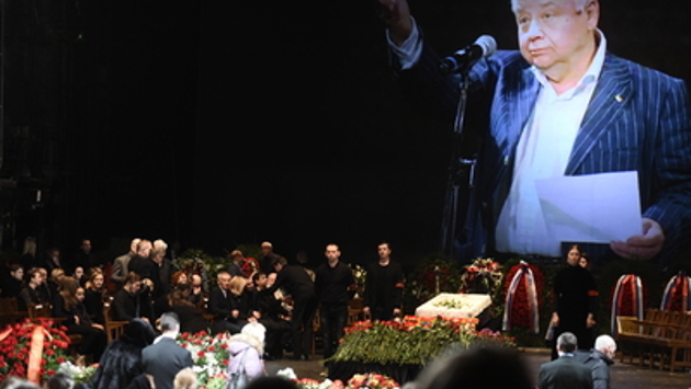Владимир Путин пришел проститься с народным артистом СССР, художественным руководителем МХТ имени Чехова Олегом Табаковым, скончавшимся в понедельник на 83-году жизни. Церемония прощания проходит на исторической сцене МХТ имени Чехова в Москве. Глава государства возложил бордовые розы к гробу покойного, а затем подошел к родным Табакова и выразил им соболезнование. С самого утра почитатели таланта Табакова, его друзья, деятели культуры, представители власти приходят в театр, чтоб почтить память великого артиста. Церемония прощания, как ожидается, продлится до 14.00, похоронят Табакова на Новодевичьем кладбище в Москве.