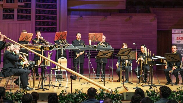 А объединил этих всех замечательных музыкантов на одной сцене Российский роговой оркестр и его создатель и руководитель Сергей Поляничко. Этот оркестр появился в 2006 году, его целью стало воссоздание культуры рогового оркестра. Само по себе явление под названием роговой оркестр уникально. Роговой оркестр существовал только в России и у него, в отличие от большинства музыкальных жанров, идей и событий, есть точно известная дата возникновения - это 1751 год, когда капельмейстер гофмаршала Семёна Кирилловича Нарышкина Ян (Иоганн) Мареш продемонстрировал своему патрону оркестр из охотничьих рогов. Каждый из таких инструментов мог издать лишь один звук, одну ноту. Поэтому исполнение музыкальных произведений таким образом требовало чрезвычайных усилий и координации, это были оркестры, в которых играли крепостные. Аркадий Шилклопер, один из солистов в этом концерте рассказал об этих музыкантах: "У них даже не было имён, их так и называли - скажем, ля-бемоль второй октавы. Представь себе - вот человек всю жизнь играет ля-бемоль". Роговой оркестр. Фото: пресс-служба ММДМ Кстати говоря, в этих словах заложена очень важная мысль - ведь в нынешней "инкарнации" рогового оркестра заложен чрезвычайно радикальный парадокс. Музыканты, их которых состоит этот оркестр отличаются высочайшим уровнем профессионального мастерства и культуры - это трубачи, валторнисты, тромбонисты, тубисты, работающие в лучших оркестрах Санкт-Петербурга, а идея и сущностный смысл рогового оркестра - это, говоря кратко, одна из форм ментального рабства. Если оркестровый музыкант исполняет в своём соло хотя бы музыкально-осмысленную фразу, составляющую пусть малую, но относительно завершённую часть произведения, то музицирование, если так можно выразиться, в роговом оркестре, это доведённая до своего логического предела технология "человек-клавиша". Я этот вопрос и задал Аркадию Шилклоперу, поскольку он уже не первый год сотрудничает с оркестром и С.Поляничко, сформулировав его примерно следующим образом: "Каким образом в этом оркестре сочетается менталитет свободного человека с исполнением технологически абсолютно рабской музыки?". "Я считаю, что это игра, такая коллективная игра, можно сказать, своего рода спорт. Я видел как они репетируют - садятся человек пять в уголочек и отрабатывают одну маленькую гаммку. Они очень долго учат - такое произведение как "Лунная соната", они полгода учили". Это, своего рода, исполнение музыки, взгляд на неё, не с позиции самой музыки, фразы или даже отдельного голоса, это исполнение музыки для оргáна, если можно так выразиться, с точки зрения самого оргáна. И это производит совершенно неизгладимое впечатление, когда оркестр исполнил Органную хоральную прелюдию фа-минор И.С.Баха - ты начинаешь понимать, что вся логика твоего понимания этого произведения, построенная на понимании развития каждого голоса, в системе координат исполнителя в роговом оркестре лишена всякого смысла, ведь он исполняет всего одну ноту, как клавиша или труба органа, для которого, собственно, и написано это произведение. При том, что из зала звучит та самая, знакомая чуть ли не с детства, прелюдия, с независимым, фразеологически-осмысленным голосоведением, с органным звучанием, и отличается оно от настоящего органа в лучшую сторону тем, что, в отличие от органа, му