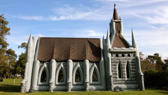 На просторах Англии в 2003 году появился необычный надувной храм, который, тем не менее, способен вместить порядка 60 человек. Высота объекта — более 14 метров, и удивительно, что он имеет витражные стекла, орган и свечи, притом что данные атрибуты тоже надувные.