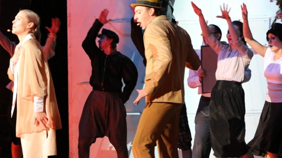 Работа артистов ТЮЗа имени А.А. Брянцева — мюзикл «Лёнька Пантелеев» на санкт-петербургских подмостках идет уже шестой год. Выезд на архангельский фестиваль «Европейская весна», который, кстати, сейчас в самом разгаре, всего лишь второй в истории спектакля — раньше актерский ансамбль выезжал с мюзиклом лишь в Москву. И действительно — внушительных размеров белые стены с поручнями и громадные металлические конструкции кажутся неповоротливыми. Но это если оценивать их отдельно от спектакля — как предметы декораций, требующие перевозки. А вот требование стать инструментом-помощником актерскому составу они выполняют на все 100 — становясь то громоздкими предметами быта — символами обыденности жизни, то воздушными конструкциями — якобы показавшимся вдалеке кораблем свободы, о котором так грезит заводила всего действа — петроградский бандит Лёнька Пантелеев. В 2012 году эту постановку создали для артистов ТЮЗа режиссеры Николай Дрейден и Максим Диденко. Имя Диденко Архангельску уже знакомо: для молодежного театра он ставил спектакль «Путями Каина», а в прошлую «Европейскую весну» ошарашил северную публику спектаклем «Конармия» по произведению Исаака Бабеля — совместной работой с артистами московской «Мастерской Брусникина». Но если тогда многим архангелогородцам работа режиссера показалась масштабной, но уж очень дерзкой и новаторской, то «Лёнька Пантелеев» заставляет зрителя то и дело улыбаться, с азартом следить за сменой действий и местами — пританцовывать. Спектакль воспринимается легко — это не масса трудночитаемых образов символов, а струящееся действо. Сюжет можно прочертить четкой линией: он любил, он мечтал, он шел на преступления, его ждала неминуемая смерть — не от шальной пули, так от закона. Что роднит этот спектакль с прошлогодним хитом фестиваля — «Конармией» — так это невероятная энергетическая сыгранность актерского ансамбля и полифоничность. Но, если «брусникинцы» всем этим работали на эффект тошноты от происходящего, то актеры «Лёньки Пантелеева» создавали светлое игровое полотно, призывая очаровываться ими. Какую бы площадку не заполняли собой исполнители — лодочный сарай, бордель, дом петербуржских нищих — везде звучат легкие музыкальные композиции 20-х годов. Здесь и «Я милого узнаю по походке», «Где твоя улыбка» и «Крутится-вертится шар голубой» (все воссоздано композитором Иваном Кушниром, тоже работавшим над «Конармией») — всё это обещает и светлое будущее. Это легкий музыкальный флёр работает на сценического — совсем не исторического — петроградского «атамана», предводителя банды Лёньки Пантелеева. Всем он друг, всем он — восторженный мечтатель о белом пароходе, где будет счастье, идеолог пиршества природной любви. Его нельзя не любить — замечают это сразу три героини спектакля. Но любовь Лёньки — это скорее яд, а не долгая и счастливая жизнь, потому все три его любви духовно умирают: законная жена Полина стервенеет и становится главарем его банды, первая любовь Анжела попадает в публичный дом, потеряв ребенка, а случайная попутчица жизни Люся Смирнова — сестра Виктора — приобретает какие-то звериные повадки. Актёрски своего «Лёньку» вытачивает питерский актер Илья Дель — сам по себе довольно хрупкий, худощавый и невысокий, но в то же время пластичный и по-бандитски резкий. Д