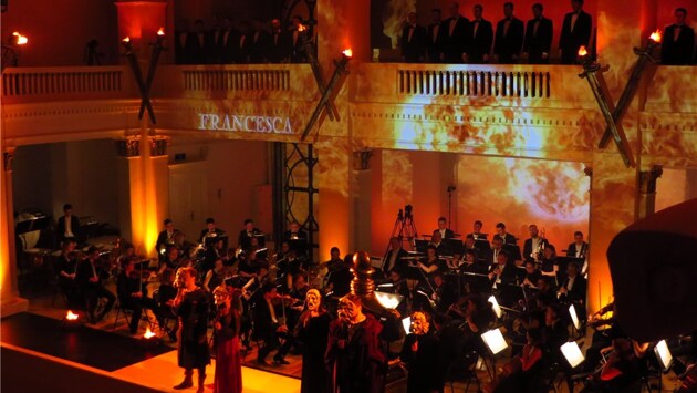 И по проходу между кресел сверху вниз к сцене спускаются Данте (Кирилл Нифонтов) и тень Вергилия (Гурий Гурьев), проводящая его по адовым кругам, описанным в "Божественной комедии". Отблески адова огня охватывают сцену, зал погружается почти в темноту, из боковых дверей двигаются фигуры – по одному проходят вдоль сцены хористы, поднимаются по залу, проходят по балкону на хоры. Словно и впрямь тени грешников проплывают мимо Данте. А наверху, в сером сумраке – двое. Две тени Паоло (Сергей Кузьмин) и Франческа (София Бачаева), грешники, чья история привлекла Поэта… Фото: Евгения Буторина Ограниченное пространство камерного зала накладывает на режиссера определенные ограничения. Сцена занята оркестром под управлением директора театра Ары Карапетяна, для действия остается лишь крохотная дорожка, на которой высится трон. Но Вячеслав Стародубцев сумел задействовать все пространство зала, создав яркую, объемную картину. Сюжет оперы известен — чтобы прекратить вражду между семьями, юную Франческу выдают замуж за хромого некрасивого правителя Римини Ланчотто Малатесту (Алексей Зеленков). Однако свататься и забирать невесту приезжает его младший брат – юный красавец Паоло. И тут-то и обрушивается на молодых людей "Любовь, любить велящая любимым". Лишь позже с ужасом узнает Франческа, что в мужья ей предназначен старший брат Паоло. И скрыть свое разочарование не в силах. А Ланчотто влюбляется в красавицу жену, и его душу терзают страсть на грани зависимости и ревность к младшему брату. Тоска и надежда – а вдруг все же… Удивительно трагическая, полная драматизма и страдания, звучит его ария, и от того, что поет он на ступеньках к сцене, которые располагаются буквально перед первым рядом, его трагический монолог обретают дополнительную интимность. Фото: Евгения Буторина Муж уезжает, приказав Паоло охранять Франческу. Горькая, драматическая ария заполняет зал. И вспыхивают на стенах факелы, зал погружается в темноту. И вот уже стены камерного зала расписаны как флорентийская резьба, а с балкона в светлый солнечный день улыбается юная Франческа. Вместе с Паоло читают они книгу о любви Ланселота и Гвиневры. Нежный дуэт безмятежной юности, с надеждой на счастье... Фото: Евгения Буторина Для Софии Бачаевой это дебютная роль, но юная актриса удивляет точной и яркой игрой, что вдвойне важно в камерном зале, где артисты и зрители буквально смотрят " глаза в глаза". Паоло Сергея Кузьмина – светлый лирический герой, его потрясающий голос уводит за собой, гипнотизирует. Артист удивительно полновесно передает все нюансы музыки Рахманинова. И вместо камерного зала видишь старинный итальянский замок, в котором царят юность и любовь… И вот тайно вернувшийся Ланчотто застаёт влюбленных, флорентийскую мозаику поглощает адово пламя. Языки его лижут стены, звучит хор, мощные голоса солистов заполняют зал, зритель становится участником трагической истории, воплощенной в музыке. Фото: Евгения Буторина — "Франческу да Римини" сегодня ставят редко, — говорит главный режиссер театра, постановщик спектакля Вячеслав Стародубцев. — И для меня главный герой там — Ланчотто, который любит искренне, для которого любовь болезненная, сжигающая. Там такие тонкие штрихи в оркестровой партитуре - виолончель, скрипка, потрясающее соло. Музыка грандиозная, так и хочется