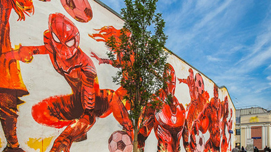 Восьмиметровое изображение играющих в мячи Железного человека, Человек-паука, Капитана Америки и Чудо-женщины размещено на офисном здании на улице Солженицына. Вторую тематическую уличную картину можно увидеть на проспекте Маршала Жукова, на торце жилого дома №21: здесь запечатлен подросток перед броском мяча на игровое поле.