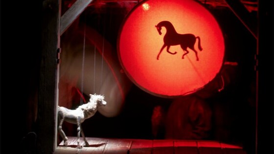 Создатель всех привезённых спектаклей – главный режиссёр Большого театра кукол, педагог, лауреат множества театральных премий — Руслан Кудашов. В его театре присутствует дух студенческого азарта, студийного творчества и созидательной доброй энергетики. Удивительно, насколько разнообразен репертуар БТК – для зрителей всех возрастов есть множество спектаклей. "Рикки-Тикки-Тави" Знакомая с детства сказка Р.Киплинга о храбром мангусте ожила на сцене под аккомпанемент восточных мелодий и танцев. Огромные бутафорские заросли джунглей, персонажи людей с увеличенными головами – наверно, именно таким выглядит мир глазами небольшого зверька: снизу – вверх. Костюмы артистов выдержаны в индийском стиле, гармонично сочетаются по цвету и знакомят юного зрителя с культурой далёкой страны. Во всех постановках этого театра много "живого плана", а ширма, к которой мы так привыкли в кукольных спектаклях, не прятала актёров и всего только несколько раз возникала в действии. Фото: БТК Рикки-Тикки-Тави чуть не утонул во время наводнения, потерял собственную семью, но обрёл новую. В постановке проводится прямая параллель между мальчиком – сыном англичанина (самого автора), живущего в Индии, и его другом – юным мангустом. Они оба познают окружающее пространство. Учатся быть храбрыми, помогать и защищать близких. Притчевая, нравоучительная сказка была рассказана весело и свежо. Без назидания звучали между сценами строчки из мудрого стихотворения Киплинга "Заповедь". "Бармалей" "Африканская песнь" по сказке Чуковского была рассказана тремя талантливыми актёрами и создана на глазах зрителей с помощью обёрточной крафт-бумаги, красок, кистей и канцелярского ножа. Для фантазии кукольника нет границ, как и для воображения детей в зале: они с лёгкостью принимали перемещения плоских картонных куколок Танечки и Ванечки по выдуманной "ужасной" Африке. Фото: БТК Наблюдая за проделками непослушных сбежавших детей, можно было пожалеть местных животных, с которыми нагло обращались юные русские путешественники. От таких незваных гостей было одно спасение – Бармалей, который тут вовсе не людоед, а защитник природы! Всклокоченная причёска, матросская тельняшка, нарисованные усы – это скорее ньюсмейкер, чем злодей. У него тут же берут интервью для выпуска теленовостей. Ему просто не хватало любви и друзей. Но добрый город Ленинград перевоспитал вчерашнего преступника. И можно поверить, что такие артисты и спектакли смогут посеять в зрителях что-то человеческое. "Холстомер" "Хроника спасения одной души", — так охарактеризовано авторами спектакля смысловое решение для экзистенциального спектакля по одноимённому произведению Л.Толстого. Спектакль представлен на сцене как предсмертная исповедь — жизненный путь от появления откуда-то из неведомого пространства, залитого светом, в жестокий мир, до горького финала, но с продолжением земной жизни несчастного Холстомера, правда, уже в ином виде. Ранимый, трогательный герой (как литературный прообраз "маленького человека") противопоставляется безликим людям-зверям. Фото: БТК Нелюбовь окружения: от матери – лошади до хозяев, была основана всего лишь на его внешней неказистости от рождения. Пегий мерин не должен иметь продолжения рода, не имеет права обходить более красивых любимцев барина, и стал никому не ну