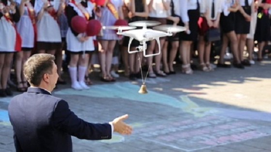 Во время торжественной линейки руководство лицея №1 решило изменить традицию, по которой выпускник несет на плече первоклассницу. Перед вчерашними школьниками директор учебного заведения запустил в небо квадрокоптер с привязанным колокольчиком.