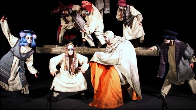 На VIII окружном театральном фестивале «Белое пространство» (30 мая — 4 июня, Сургут) театр актёра и куклы «Петрушка» показал свой «Опыт прочтения пьесы «Король Лир» при дворе царя Гороха». И хотя премьера спектакля состоялась 22 октября 2016 года и я уже несколько раз видела эту прекрасную постановку (сколько видела — столько мнения и менялись), всё же хочу поделиться своим первым отзывом. Я знаю, чем закончится «Игра престолов», вы нет? Неужели? Хорошо, когда «искусство» адаптируется к языку современного человека. Сюжетов только не много — поумничаю, но напомню вам про такого товарища как Владимир Пропп. В его «Морфологии волшебной сказки» прямо указывается: есть 40 мировых сюжетов, от них и пляшите. Шаг влево, шаг вправо — а все равно одно и то же. И вот пока Пропп-филолог разбирал тексты про скатерть-самобранку, разбойника и жертву, в другой вселенной орудовали многогранные философы, которые носились друг к другу по коридорам с идеей постмодернизма, кляли на чем свет стоит старика Ницше и провозглашали всенаписанность. Если вы уже поняли, о чем дальше пойдет речь, то … сами свяжете «Игру престолов» с Шекспиром, а я пока расскажу о спектакле, поставленном в северном Сургуте. Про политику …И вот стоит умерший царь Горох над массовым трупным действием и я чувствую, что ком к горлу медленно, но навящево подлезает. Перед ним пластом лежат две дочери, их мужья, где-то под сценической платформой — утонувшая Жанна ДАрк по имени Млада, а на пике — насквозь проткнутый шут. Еще пара минут и «вдруг посыпался горох» станет не строкой из детской считалочки, а завершением того балаганного трагифарса, который создал режиссер Дмитрий Вихрецкий, взявший за основу материал драматурга Игоря Шишкина. 400 лет назад Англии — все равно, что современная Россия. Все равно, что древний славянский мир. Разницы нет. И там, и там мечта о заповедях «не убий, не укради» лишь существует в головах религиозных фанатиков (простите — верующих). «Опыт прочтения пьесы «Король Лир» при дворе царя Гороха» — это вечно злободневная история про нас с вами прошлых, настоящих и будущих. Это не про отношения между отцом и его тремя дочерьми — это сугубо про политику. Единственно праведная младшая дочь — Млада («и как политик очень молода» говорится о ней в спектакле) — стоит перед народом с массивным гаечным ключом, утирает нос, говорит басом. Мужиковатая, с длинной белокурой косой и огромными глазами (как и требуется для подсознательного восприятия Древней Руси), честная и « Богом творчеством не тронутая». Ни петь, ни плясать, ни читать стихи она не умеет. Зато умеет обнаруживать ложь близких родственников. Именно она заступается за изгнанного царя, который к концу спектакля и не царь уже вовсе, погибающего от рук вероломных сестер — властной Власты и изощренно мыслящей Забавы. В сетях да в омут с головой — вот ее конец. «Ведь на собственном примере судьбу я Лира повторил, Зачем же в школе не учил Шекспира?» — говорит уставший мешковатый старик, вот-вот готовый обрести безумие, ещё в начале так радостно и сладко разделивший собственное царство между дочерьми назло шуту, твердящему, что в мире только вечные сюжеты. Шекспир — тот, с кем пушкинский привычный пир во время чумы, выдернутый из того же английского контекста Джона Вильсона («Чумной город»), обретает новую реальность. Хотите