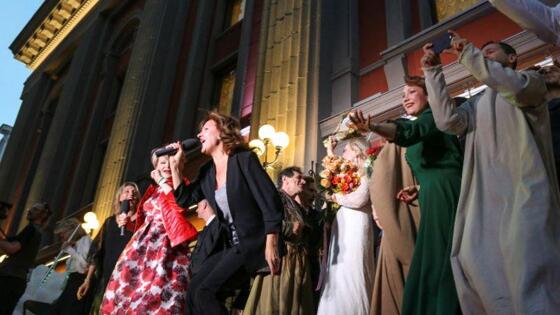 МОСКВА, 23 июня. /Корр. ТАСС Ольга Свистунова/. Государственный академический театр имени Евгения Вахтангова устроил в пятницу уличный праздник на Арбате по случаю закрытия очередного, 97-го сезона. Тематику вечера определила дата - 22 июня - день начала Великой Отечественной войны, передает корреспондент ТАСС. Пролог "Наш праздник совпал с великой и трагической датой - 22 июня 1941 года началась Великая Отечественная война", - объявили ведущие концерта Марина Есипенко и Кирилл Рубцов. И на импровизированных подмостках перед входом в театр появились молодые вахтанговцы, в исполнении которых прозвучали песни военных лет "Жди меня", "Скромненький синий платочек", "Путь-дорожка фронтовая". Пели вместе с уличным хором под аккомпанемент театрального оркестра и аплодисменты зрителей. Публики собралось много. Уличные концерты по случаю закрытия сезона Театр Вахтангова проводит уже девятый год подряд, и это стало хорошей традицией. "Здравствуй, Арбат", - провозгласил появившийся на сцене народный артист СССР Василий Лановой. "Я уже 61 год работаю в Вахтанговском театре, поэтому могу называть эту улицу родной", - отметил актер, напомнив, что три с половиной года провел в оккупации в Виннице и видел войну в лицо. Лановой читал стихи о войне, а потом исполнил песню из фильма "Офицеры", которому, как сказал артист, в этом году исполнилось 47 лет. Музыкальные номера также представили публике вахтанговцы Ольга Тумайкина, Юлия Рутберг, Александр Олешко. Театральный праздник После пронзительного пролога перешли к делам театральным. Напомнили, что в этом году Вахтанговский театр открыл новую сцену, шестую по счету, которую назвали Симоновской в честь династии театральных режиссеров Рубена и Евгения Симоновых. Поблагодарили тандем худрука Римаса Туминаса и директора Кирилла Крока. Последний выступил в непривычном амплуа - исполнил куплеты директора театра из аншлагового спектакля "Мадемуазель Нитуш". Представили и участников нового спектакля, премьерой которого 15 сентября откроется 98-й сезон Театра Вахтангова. Это будет "Фальшивая нота" в постановке Римаса Туминаса, исполнителями ролей выступят народные артисты России Алексей Гуськов и Геннадий Хазанов, который признался, что в свое время не был принят в Щукинское училище по причине "отсутствия юмора и темперамента". "Теперь, спустя 55 лет, мечта сыграть в Вахтанговском театре, похоже, начинает сбываться", - сказал Хазанов. В это время в зале закончился последний спектакль 97-го сезона - "Царь Эдип" в постановке Римаса Туминаса, и занятые в нем Людмила Максакова, Евгений Князев, Виктор Добронравов, Эльдар Трамов, Максим Севриновский, Артур Иванов, Валерий Ушаков, Екатерина Симонова, а также участники Хора - артисты Национального театра Греции - присоединились к уличному празднику, который завершился овацией уличной толпы и красочным фейерверком.