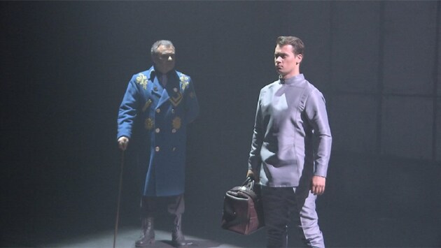 Постановочно опера решена с помощью минималистских средств - одна зона это собственно сценическое пространство, интерьер которого создаётся различными комбинац иями кубов, которые становятся то учебными столами в академии, то огромным столом в Параморе, когда беседа в семье напоминает скорее разбор персонального дела на партсобрании, то ящиками, в которых хранятся элементы обмундирования, то своего рода объёмами, из которых вылетают воздушные шары, буквы на которых создают надпись "peace".