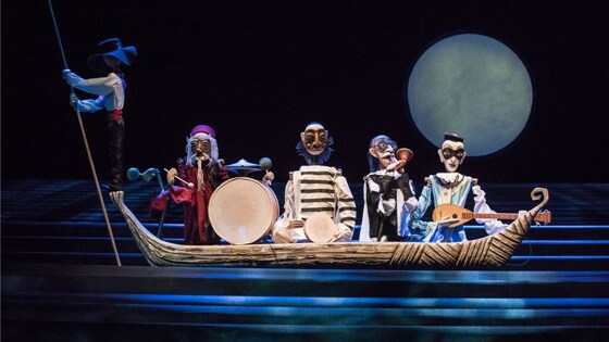 Само действие трагикомедии Карло Гоцци происходит в Китае, премьера же самой “Турандот” состоялась на родине драматурга, в венецианском театре Сан Самуэле 22 января 1761 года, директором которого 4 года был знаменитый Карло Гольдони. Италию и Китай, запад и восток, Астрахань, Хорезм и Хорасан объединила на сцене и постановочная команда спектакля театра Образцова: режиссер – лауреат Российской национальной театральной Премии "Золотая Маска" Борис Константинов, художник – лауреат Российской национальной театральной Премии "Золотая Маска" Виктор Антонов и композитор Катя Миц. Им удалось создать на сцене настоящее волшебство, пёстрое кукольное действие, не лишённое, конечно, комедийного начала, шуток и счастливого конца. Фото: пресс-служба театра кукол С. В. Образцова С первой минуты представления зритель оказывается в самой Венеции, ибо действие происходит под красивейшей аркой, коих в итальянском городе множество. Из окошечек арочных квартирок выглядывают маски комедии дель арте – начальник евнухов Труффальдино, начальник пажей Бригелла, великий канцлер Тарталья и секретарь Панталоне. Именно они, итальянские весельчаки и балагуры, будут сопровождать всё действие, переплетая шутками и прибаутками историю китайской принцессы и астраханского принца Калафа, конец которой, конечно, будет счастливым, ибо сами маски, смешные властители жизненного удела героев (пародия на греческих богинь судьбы так и напрашивается), его и придумают. Фото: пресс-служба театра кукол С. В. Образцова Само же действие разворачивается в лодках, больших и маленьких, простых и инкрустированных диковинными резными узорами с драконами и змеями (вот дань восточному происхождению надменной красавицы!). На лодках, по водной глади, впрочем, часто бушующей, проплывают все герои пьесы, тростевые куклы, выполненные из бамбука, гибкие, изящные, сотканные из восточных тканей и шелков – принцесса и её слуги, маски, пажи, принц Калаф, наложницы Турандот. Они разговаривают, ссорятся и смеются, делятся своими горестями и печалями, советами, угощая друг друга чаем, дрейфуя по воде среди зарослей бамбука. Под мертвенно-бледной холодной луной (всё действие происходит в сумеречно-тёмном пространстве) одна мизансцена сменяет другую, на эшафот отправляются неудачливые женихи, жаждущие сердца Турандот. Коричневые, красные, оранжево-зелёные, сиреневые и жёлтые краски действия и костюмов персонажей, чудная музыка, соединившая традиции запада и востока, завораживают чародейством и очарованием. Вся эта история выглядела бы очень жестокой, немилосердной и страшной, если бы неизбывный добрый комедийный юмор героев и постановщиков действия. Да, конечно, эшафот или гильотина – приспособления прямо скажем – зловещие и трагические. Однако в нашей кукольной истории о китайской принцессе и её женихах гильотина крутится вместе с приверченным на ней красным кругом, затейливо и вдруг превращающимся в веер. Вот так диво – красное колесо судьбы, колесо фортуны и рока, беспощадное и жестокое с одной стороны, но понарошечное и игрушечное – с другой (копия такого же эшафота расположилась и в холле театра, так что каждый может испытать на себе это приспособление). Фото: пресс-служба театра кукол С. В. Образцова Но смелый и храбрый астраханский принц Калаф справится со всеми загадками краса
