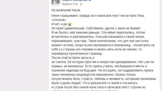 По словам Марии Захаровой, после встречи с певицей она не спала ночью, а утром написала текст, строчки из которого и вошли в композицию. Официальный представитель министерства иностранных дел России Мария Захарова стала соавтором новой песни для певицы Кати Лель. — Меня спрашивают, правда ли я написала текст песни Кати Лель "Сполна". И нет, и да. История удивительная, — написала официальный представитель МИД России на своей странице в Facebook. По словам Захаровой, после встречи с певицей она не спала ночью, а утром написала текст, строчки из которого и вошли в композицию.