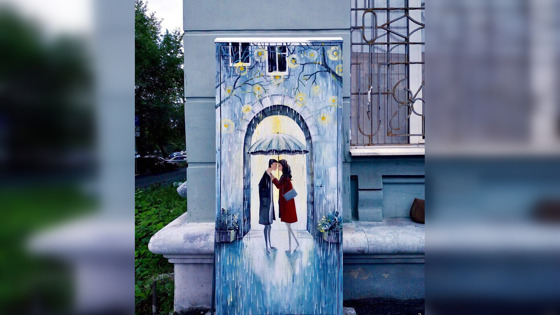 Влюблённые под дождём: челябинские художники превратили серую будку в центре города в арт-объект