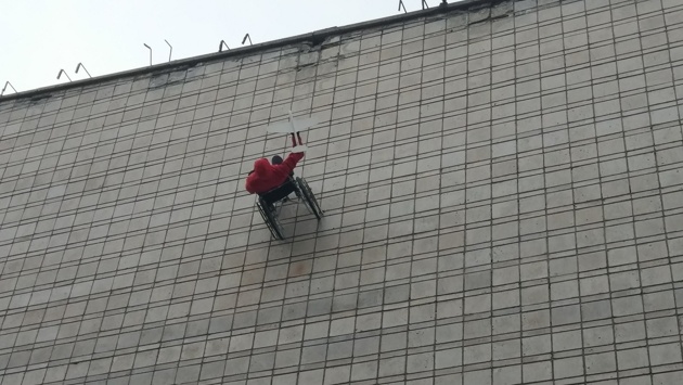 К стене кинотеатра Маяковского приделали инвалидную коляску с манекеном