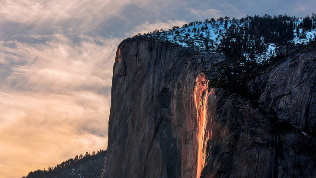 В Калифорнийском Йосемитском парке находится горная гряда под названием Эль-Капитан. Восточный склон горы особенно привлекает туристов своей удивительной достопримечательностью. На этой стороне находится водопад Лошадиный хвост, который давно окрестили “Огненным водопадом”.