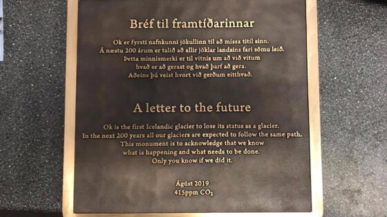 «Ок – первый исландский ледник, который потерял свой статус. В ближайшие 200 лет все наши ледники, как ожидается, пойдут по тому же пути. Этот памятник должен свидетельствовать, что мы знаем, что происходит и что нужно сделать», – гласит надпись на табличке.