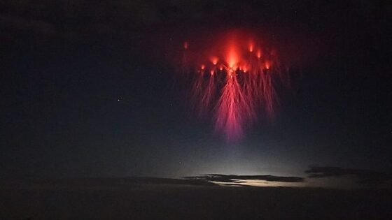 Похожие на щупальца красные молнии называют спрайтами. По данным Европейского космического агентства, это сверхбыстрые электрические разряды, которые с треском проходят через верхние слои атмосферы — на высоте от 60 до 80 километров — и движутся в космос.