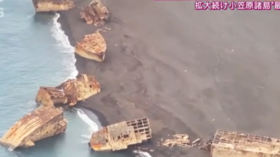 Выброшенные на берег части кораблей показала телесеть All Nippon News. Они лежат на вулканическом пепле.