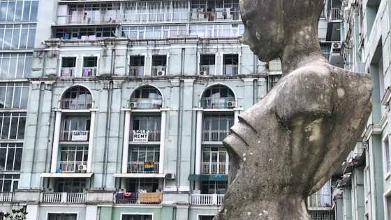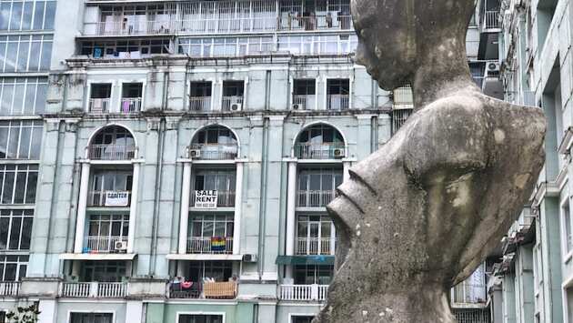 Первый этаж дома должны были занять магазины и кафе, но дом настолько пропах плесенью, что сейчас эта свалка из сломанных дверей и окон. И если на внешней стороне дома еще можно найти кофейню или магазин, видимо, потому что это более солнечные стороны, то внутри только мусор и прибежище для нищих.