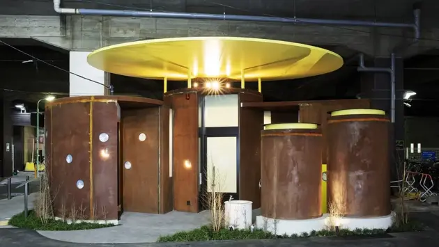 Новая уборная появилась в рамках проекта Tokyo Toilet Project рядом с одной из станций метро в центре города. Туалет состоит из цилиндрических блоков из стали. Верх увенчан ярко-желтым диском, который закреплен на центральном самом высоком цилиндре. Блоки разделены на комнаты для мужчин и женщин, еще один цилиндр служит туалетом для инвалидов, внутри также есть пеленальные столики.
