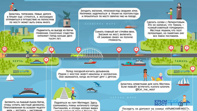 На официальных аккаунтах Крымского моста в социальных сетях опубликованы рекомендации автомобилистам, которые в ближайшие дни поедут по крупнейшему инфраструктурному объекту длиной 19 километров. Первым делом путешественникам советуют посидеть на скамейке рядом с центром управления проездом на таманском берегу и на фирменной скамейке сфотографироваться на фоне изумительной перспективы моста. Второе селфи можно сделать у памятника Михаилу Лермонтову в Тамани, который когда-то написал, что "Тамань - скверный городишко". Кому-то повезет больше остальных, и тогда, запасшись любимым лакомством кота Мостика - креветками - можно будет покормить живого талисмана стройки. Другие рекомендации касаются проезда по самому мосту. Во-первых, ехать по его полотну надо под хит стройки "Я забиваю сваю". По пути можно следить за дельфинами нескольких видов, а под аркой моста - загадать желание. "Например, задержаться в Крыму на полтора года и прокатиться по мосту обратно уже на поезде". На Керченском берегу автомобилистам советуют проехать на гору Митридат и полюбоваться руинами античного города Пантикапея, откуда тоже прекрасно виден мост. На въезде в Керчь гостей встретят символы города грифоны. Есть и гастрономический совет - заехать на керченский рыбный рынок и купить там деликатес боттаргу - прессованную сушеную икру серой кефали. Последний совет - запастись терпением, поскольку трасса "Таврида", начинающаяся после построенного автоподхода, еще только возводится и пока не способна пропустить большое число автомобилей. Напомним, накануне открыт для автомобилей путепровод над автоподходом в Крым с керченской стороны. А сегодня Госкомитет дорожного хозяйства РК заявил о завершении строительства самого автоподхода.