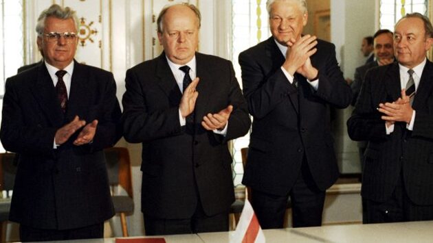 Распад СССР и создание СНГ чисто юридически совпали по времени. 8 декабря в Беловежской пуще (резиденция Вискули) на территории Белоруссии президенты России (РСФСР) и Украины — Борис Ельцин и Леонид Кравчук, председатель Верховного Совета Белоруссии Станислав Шушкевич, констатировали распад Советского союза, а также подписали Соглашение о создании СНГ.
