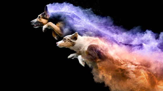 Для большей выразительности фотограф использовала цветной порошок, который подчеркивал динамичные движения собак, придавая им вид яркого вихря.