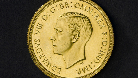 Интересна история этой монеты. Дело в том, что было выпущено всего шесть таких соверенов, но их так и не пустили в массовую чеканку, потому что король Эдуард VIII отрекся от престола ради женитьбы на разведенной американке Уоллис Симпсон.