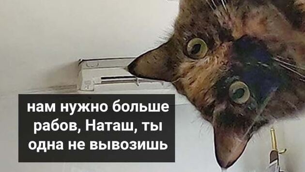 Поначалу питомцев у несчастной Наташи было всего двое, но потом их количество увеличилось, а сама картинка поменялась. Теперь несколько котиков смотрят прямо в на пользователя Сети, выдавая фразочки, подходящие актуальным событиям и новостям. Наташа — это, по сути, каждый из нас.