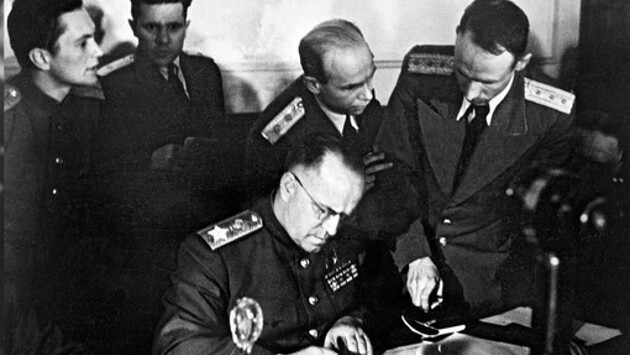 8 мая 1945 года по среднеевропейскому времени, когда в Москве уже наступило 9 мая, в Карлсхорсте был подписан акт о безоговорочной капитуляции нацистской Германии. Это был второй подобный документ. Первый подписали 7 мая в Реймсе, однако Иосиф Сталин отказался его принять и потребовал проведения еще одной церемонии, которая бы прошла по сценарию советской стороны. В итоге капитуляцию нацистов принимал командующий 1-м Белорусским фронтом маршал Георгий Жуков.