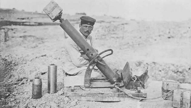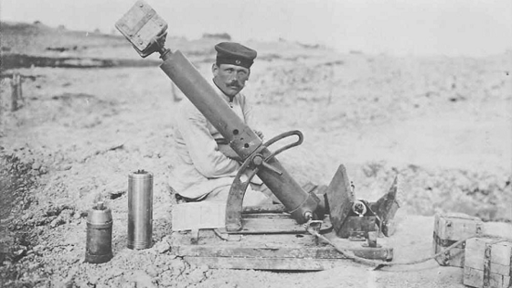 Сконструировал надкалиберную мину со стабилизатором буквально из подручных средств. Стволы морских 47 мм орудий закрепил на колесных лафетах. Когда же их не хватило, приспособил просто металлические трубы на деревянных колодах. Вместо обычных снарядов использовал самодельные шестовые мины, что выпускались под углом от 45 до 85° по навесной траектории, и могли уничтожать закрытые цели, недоступные ружейно-пулеметному и артиллерийскому настильному огню.
