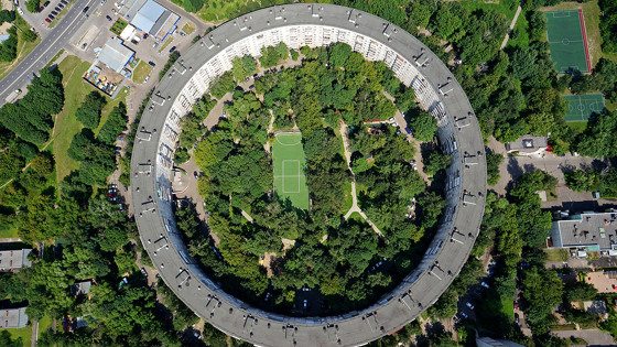 За круглый дом отвечал архитектор Евгений Стамо. Когда видишь его впервые, отсутствие разрывов в огромном кольце впечатляет. Построить такое здание помогла погрешность в 6 градусов при монтаже стандартных панелек. Именно благодаря этой погрешности удалось заключить типовую девятиэтажку в кольцо диаметром 155 метров. Дом строился специально к Олимпиаде-80, изначальная задумка подразумевала строительство пяти таких домов, но в итоге в Москве построены всего 2 таких сооружения.