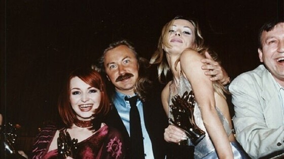 Катя Лель, удивленный Игорь Николаев и Ирина Салтыкова на вручении премии «Овация», Москва, 1999 год.