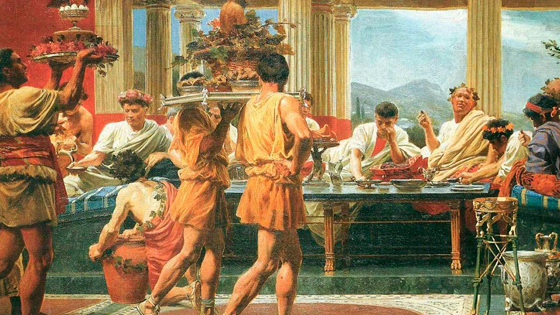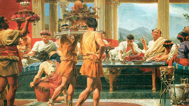 Правила приличия в Древнем Риме позволяли брать еду руками. После приема пищи руки не мыли — обычно их вытирали о волосы рабов, которые всюду следовали за хозяином.
