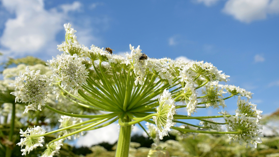 Борщевик достигает почти четырех метров в высоту, имеет толстый стебель, который трудно сломать, большие белые зонтики с мелкими цветами и крупные листья. За сутки растение может вырасти на 10 см ввысь.