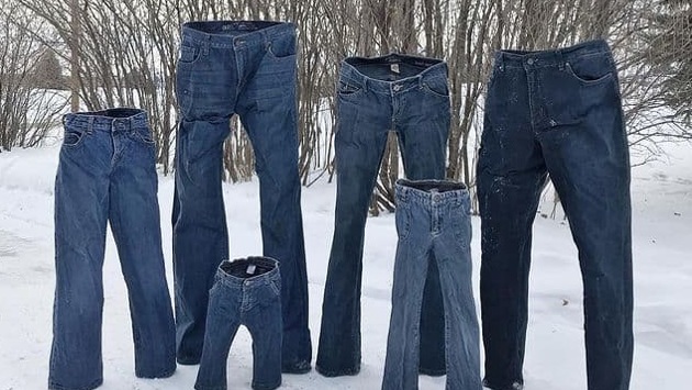 Чтобы сделать также, нужно намочить одежду и вынести на мороз. Через 20 минут ей можно придать форму, а еще через столько же ткань полностью затвердеет. При этом метод сработает, только если мороз достигнет 0 градусов по Фаренгейту (около -18 градусов по Цельсию).