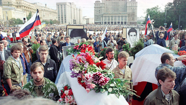 Ельцин каялся перед родителями погибших, что «не смог уберечь» их сыновей. Московский градоначальник Гавриил Попов использовал трибуну, чтобы обратиться к москвичам с призывом «после победы <…> брать молотки и строиться». А Михаил Горбачев кланялся от всей страны перед отцами и матерями молодых людей, «отдавших жизни, вставших на пути тех, кто хотел вернуть страну в мрачные времена тоталитаризма, столкнуть в пропасть, привести к кровавой бойне».