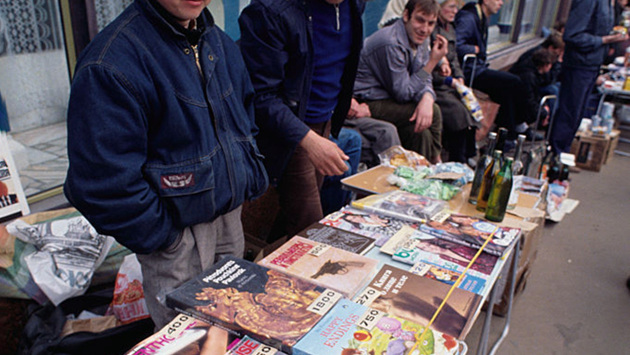 На снимке двое мужчин стоят у прилавка с эротическими зарубежными журналами. Судя по ценникам, нарисованным по трафарету от руки, каждый экземпляр «эротики в руки» в то время предлагалось приобрести за 400 рублей.