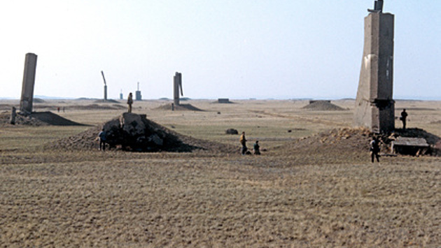 На этой равнине в 1947 году Советский Союз начал одну из самых грандиозных строек в своей истории. В первую же зиму к работам были привлечены около девяти тысяч военных строителей. Почти два года солдаты и офицеры жили в палатках и землянках и получали обморожения, что приводило к ампутациям пальцев на руках и ногах. Одновременно в 60 километрах от полигона началось возведение жилого и административного центра — сегодня это город Курчатов в Восточно-Казахстанской области Казахстана. Там разместился Центральный штаб Семипалатинского полигона.