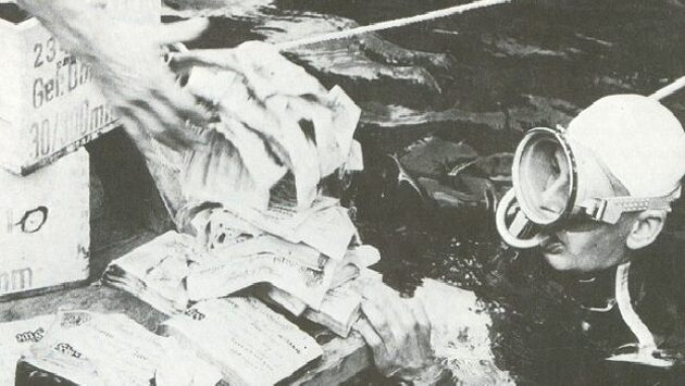 Аквалангисты «Штерна» подняли 15 деревянных и железных ящиков, в которых исследователи обнаружили фальшивые купюры английской валюты на сумму 55 тысяч фунтов стерлингов. Кроме фальшивых денег были обнаружены списки узников концлагерей и документы Главного управления имперской безопасности.