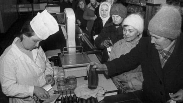 В большинстве торговых точек страны покупка происходила по странной и бестолковой системе. Покупатель, отстояв очередь к прилавку, выбирал или взвешивал товар у продавца. Там он брал кусочек бумаги с наименованием покупки и ее весом, а потом отправлялся на кассу платить. Отстояв еще одну очередь, он оплачивал товар и на кассе ему выдавали чек.