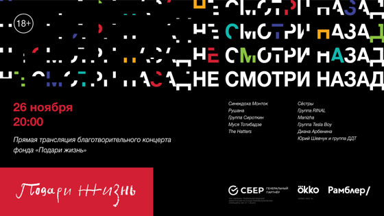 26 ноября, в честь своего 15-летия, фонд «Подари жизнь» проведет благотворительный концерт «Не смотри назад» в театре «Современник». Прямая трансляция концерта с участием The Hatters, MANIZHA, Tesla Boy, “ДДТ”, Дианы Арбениной и других артистов будет доступна в мультимедийном сервисе Okko и на портале «Рамблер», входящих в экосистему Сбера. Во время трансляции каждый зритель сможет пожертвовать любую сумму на лечение подопечных фонда.