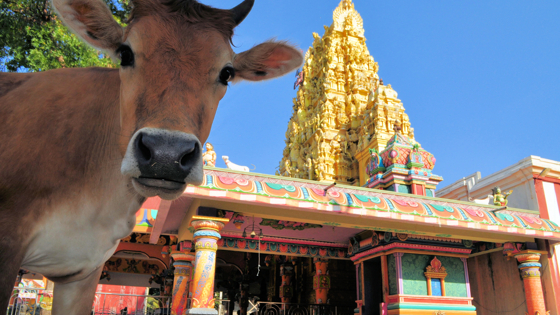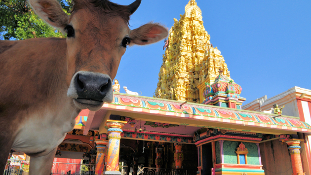 В индийском городе Индор начали поклоняться необычному теленку. Животное появилось на свет с четырьмя глазами и двумя ртами. Об этом сообщает The Mirror.