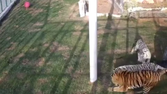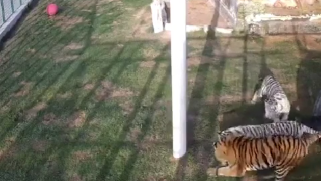 На записи три ее тигра окружили котенка. Смотрители попытались спасти животное, но один из хищников схватил его в зубы и убежал.