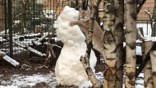 В Калининграде рысь по кличке Сатик обняла вылепленного из снега медведя. Видео опубликовали на странице местного зоопарка во «ВКонтакте».