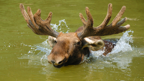 Лоси - прекрасные пловцы. Они могут нырять на глубину до пяти метров. В это трудно поверить, потому что мы привыкли к образу достаточно нелепого, немного неповоротливого животного с большими рогами. Но оказалось, что лоси прекрасно чувствуют себя в воде.