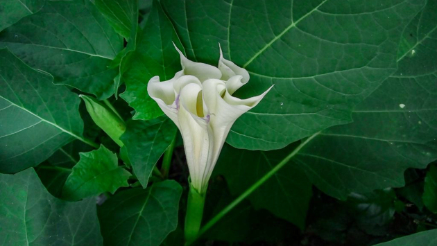 Произрастающее в Индии, на Аравийском полуострове, растение называют "цветок смеха", настоящее его название "дурман индийский". Растение это однолетнее, его высота может достигать около 120 см, а сами цветы способны вырасти до 20 см. Несмотря на довольно привлекательный вид, аромат у цветка весьма неприятный. Да и коробочка цветка покрыта шипами. Таким образом растение защищает свои семена. А еще защита проявляется и другим, необычным образом.